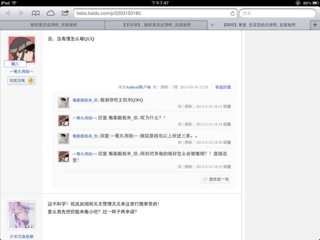 我曾是生花花的日常吧的吧主,个人认为对贴吧尽心尽责,当我把这件事告诉吧内的亲们,他们也感觉很不可思议。虽说如此但仍然惨遭“厄运”,被贴吧管理系统的被弄下了下来。我觉得自己做的虽不说完美,但也是尽了相当多的心血。3月13日就已经在申诉的帖子里说明了自己的情况,但仍未收到任何答复。
