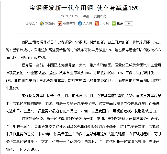 宝钢研发新一代车用钢 使车身减重15% 已经正式生产