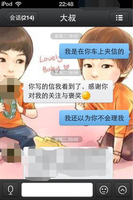 大叔29岁,喜欢很久了……于是思考之下,我给大叔写了信(后来同学说那是战书),再后来我又写了信,加在大叔的爱车上,还附上了QQ,本来以为大叔会无视我!没想到居然加了,好激动!他说我的信他都看到了,感谢我的关注,还说我写的不错他挺感动的……以后只要我愿意还可以继续写!