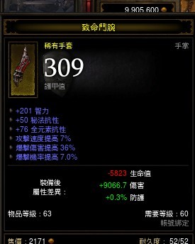 人品可以了,我做了100多个,才有一个说的过去 209力量 9.5爆率 47暴伤 39全抗...
