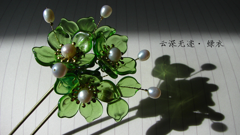 这是只捷克琉璃发钗,辅料为珍珠、黄铜配件,是我做的《聊斋志异》系列之一,名:青娥。