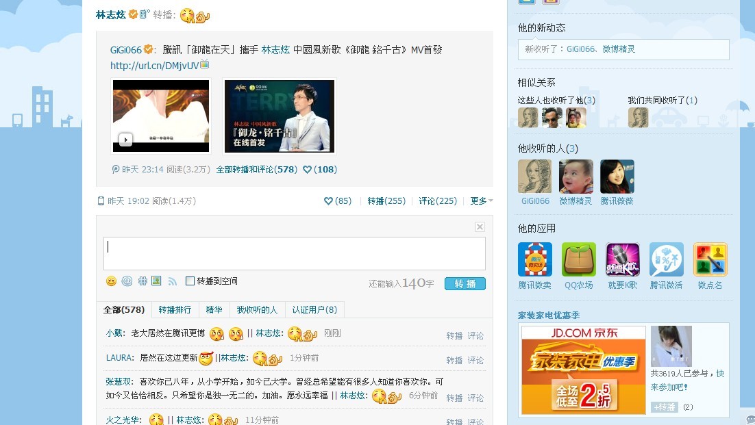 想起来了,腾讯和老大有合作。11年腾讯年终演唱会老林压轴唱了半小时