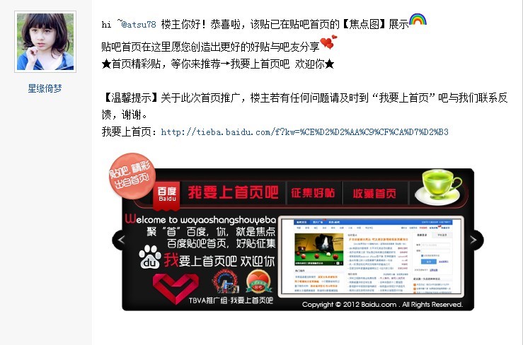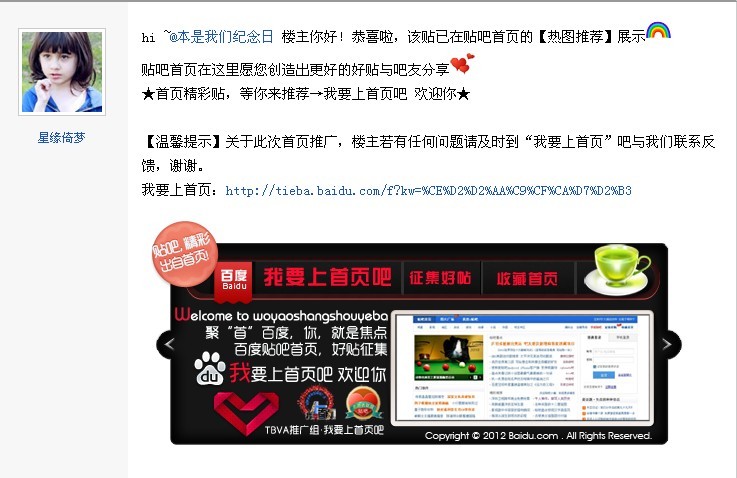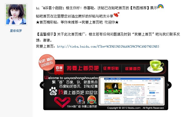 【温馨提示】关于此次首页推广,楼主若有任何问题请及时到“我要上首页”吧与我们联系反馈,谢谢。