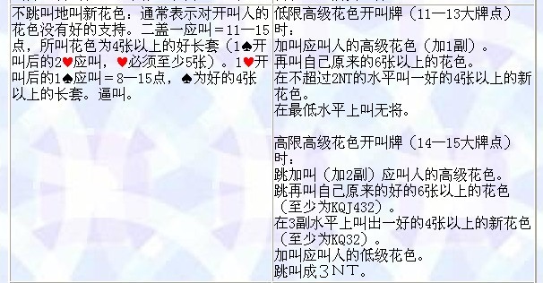 这个我们都不用了,只要在2阶及以上出新花都逼叫,不管开叫人还是应叫人,在2阶出新花而不保证点力不逼叫的话,将使得需逼叫时必须上3阶,如果在3阶还找不到配合的话,只有抓瞎了。
