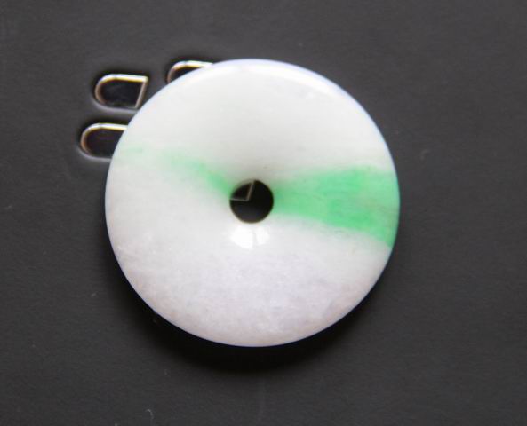 飘阳绿的平安扣,底子细腻,颜色很正,一抹绿色入高山流水一般流下来