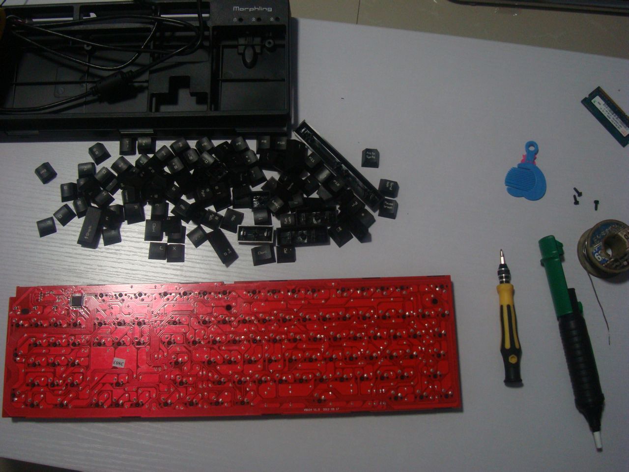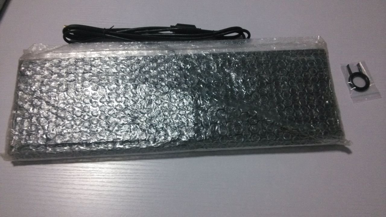 打开盒子看到,键盘的外围是一层气泡纸,这个应该能给键盘提供很好的保护吧。(Mamic没舍得摔一下试试,等以后那位吧友有兴趣可以试一下告诉我啊。让Mamic知道这个气泡纸能达到什么程度的保护键盘。 )随机没有多余的附件,就是一传说中的屌丝拨键器,试用了一下,不是太好用。