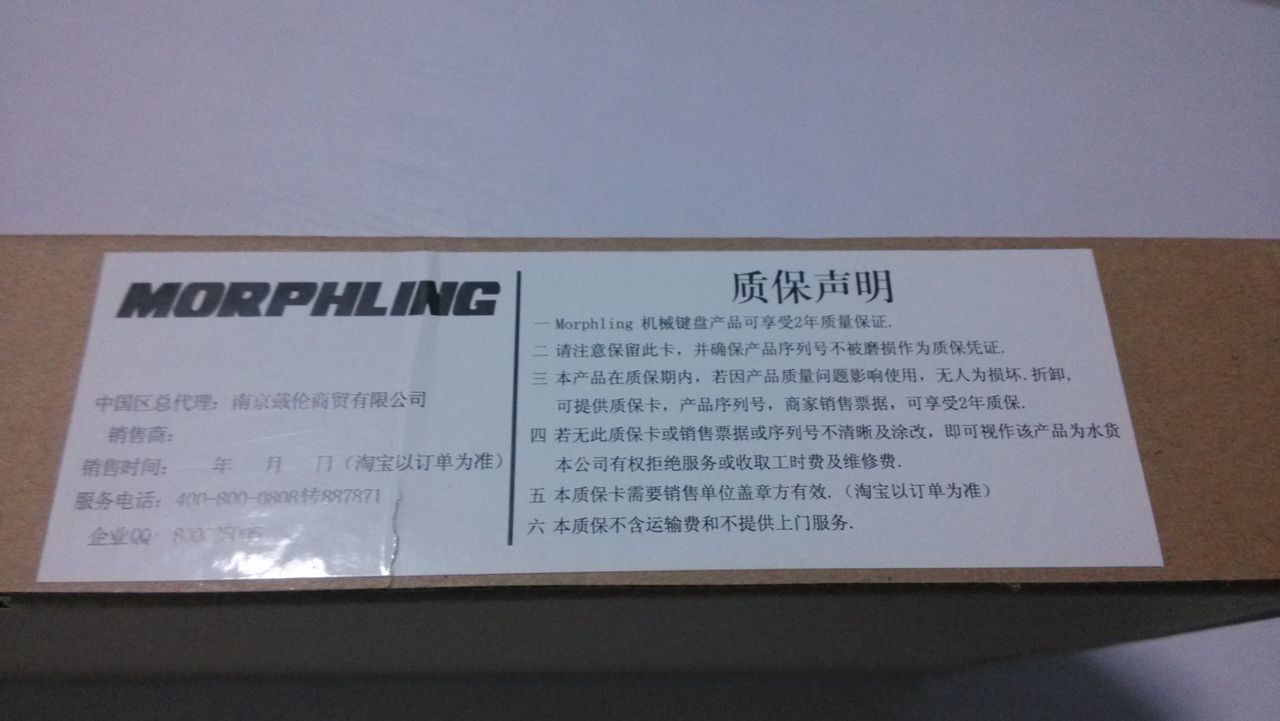 质保声明,这个贴在了盒了外面,一般应该都不会忽略掉了吧。 值得提到的一点是,这个键盘提供了两年质保,这给不会自己动手的朋友提供了一定的保障。