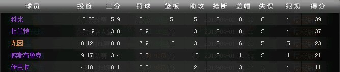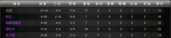 现阵容:C尤因 PF伊巴卡 SF杜兰特 SG科比 PG威少