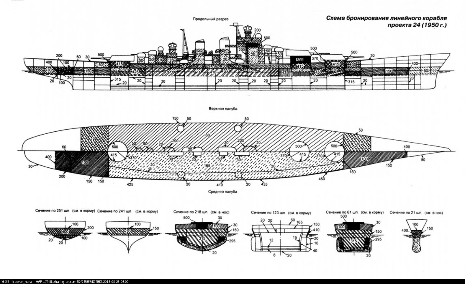 垂直防护:苏联级的主装甲带采取了渐变厚度,前部弹药库处的厚度为420mm-390mm,轮机舱处为375mm,而后部弹药库处则为380mm,倾斜角为5度。苏联级采用的装甲,其抗弹性能优劣未知,但考虑到苏联当时的工业水平,其性能应当不会超过日本装甲。结合其较小的倾角,可以认为其舷侧装甲的抗弹性能并不出众。