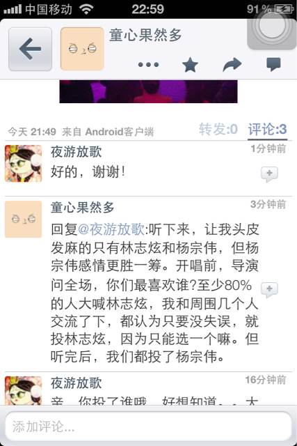 我发这个贴只想说明。。林大仙多虑了。。。。。这个赛段只能选一个最优的。。不可能所有唱的不错的都上! 而且他的理论是错的。。认为一票制。观众不理性投票。。这个截图恰巧反证了。
