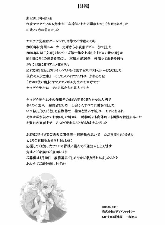 悲剧!《零之使魔》原作者山口老师因病去世