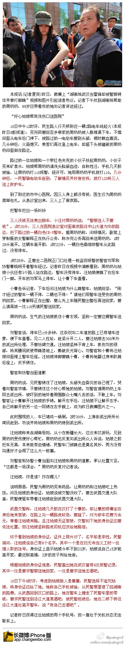 京华时报讯 前晚,有网友发帖称,一名到武汉旅游的女青年帮助受伤老