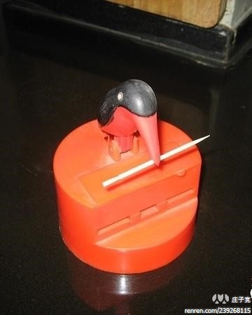 回复 hanqiprince :叼牙签的,鸟头按下去下面就自动出来一根,正好卡在鸟嘴里