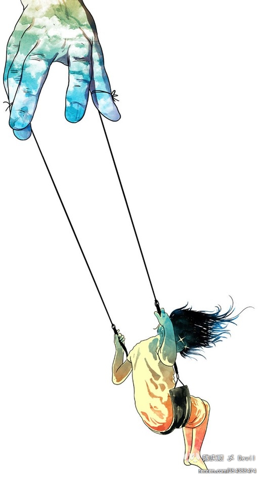 束缚她的手意味着父母 她努力的摇摆想要逃离他们并认为迟早有一天这双手会放开 可她殊不知父母一旦放开 她也就会轰然坠地