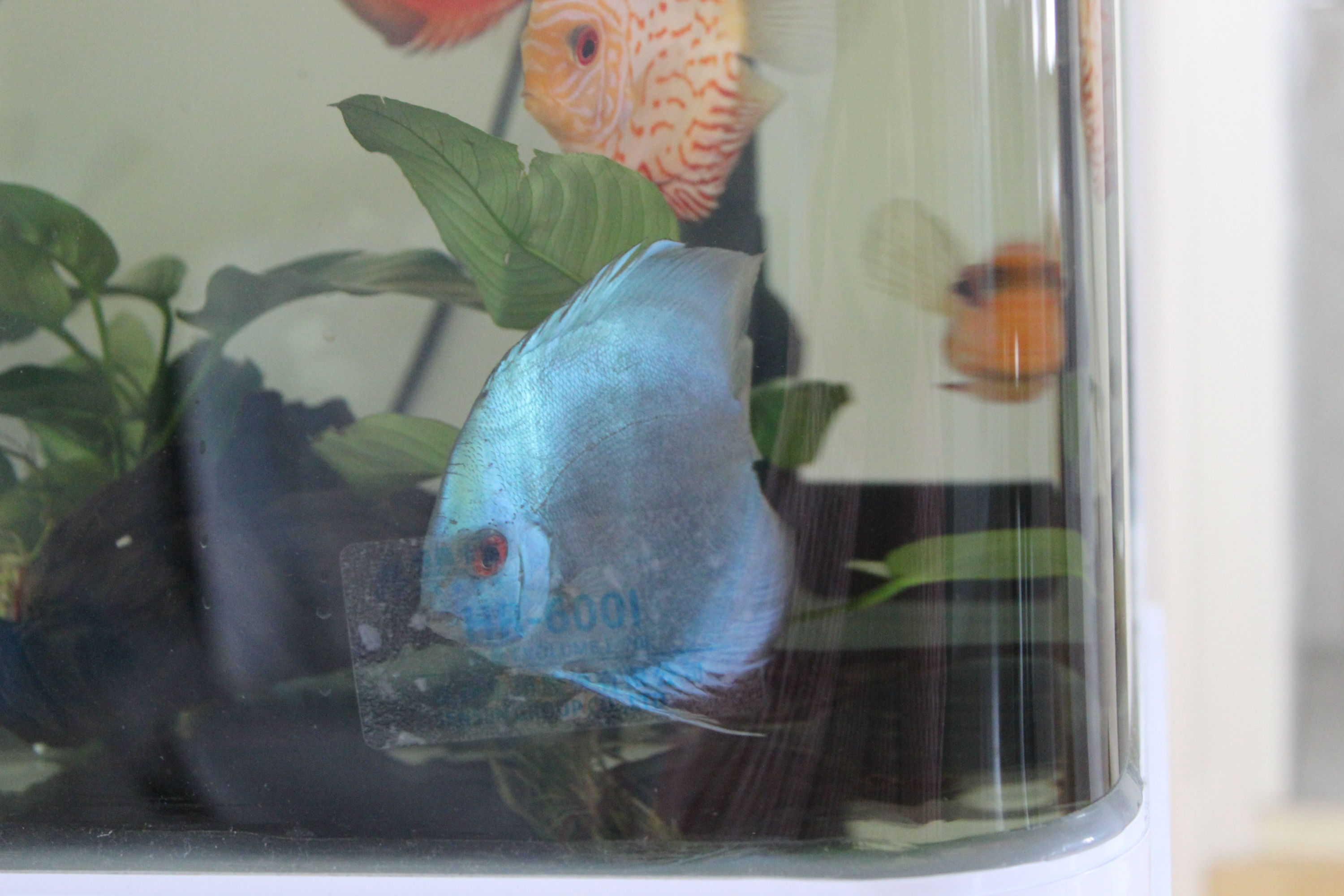 鸽子。豹点,都有不同程度的缩鳍,状态不是很好。天子蓝与豹点的尾巴看上去有点烂尾。注意保持水质。