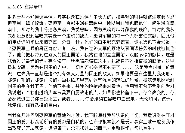 我昨晚做了两个恶梦。在第一个恶梦里我梦见自己在一大群人当中,我们都死了,但我们假装我们仍然活着。我们用尽所能去体验这里的生活,体验这个世界所能提供的最好的一切。但是我们很快就感觉到我们的灵魂被逐渐抽空,一切幸福的感觉都十分短暂,就像是一颗雪花击中了温暖的舌头,就这样我们逐渐地开始失常。我意识到我成为了恐惧军的一员,为恐惧军而战斗。突然间,有一个人出现在天空中,我们都望着这个人,他个人比我们当中任何的一个人都更像是真正活在这个世界上的人,看到这我们每个人心中都产生了想继续生存念头,此刻,我们齐声开始了发自内心的尖叫:“我应经不清楚自己是谁了!在生活上我从不觉得我是真正活着的,但这一次我有了一种如此接近活着的感觉!我会一直行尸走肉地走着,望着你,直达我不能继续为止!”我被惊醒了,因为我感受到了敌人的内心是如此的空虚,我爱他们。