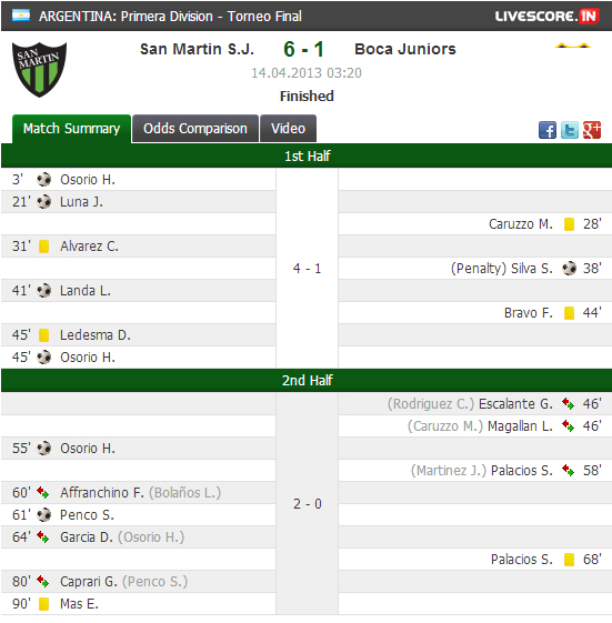 联赛第9轮,博卡客场1-6遭圣马丁屠戮,联赛八轮不胜,列联赛17
