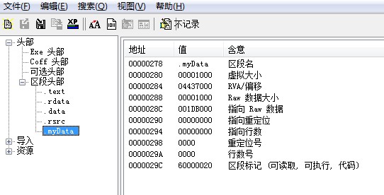 我自己在exe区段头部添加了一个.myData,按个RVA偏移啥意思?