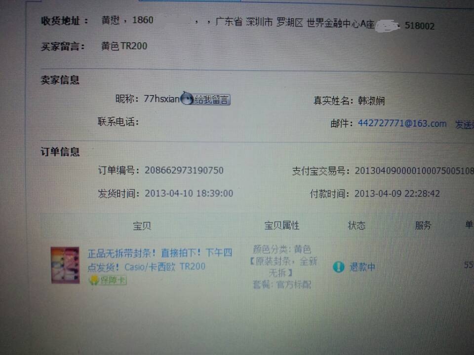 昨日15日中午,卖家就已经签收了这个黄色机器,但是昨晚旺旺上面交涉时还是不断提到要质检报告。并未明确机器已收回以及他们与收货人这边的处理方法。对之前收件人在卡西欧专卖店的咨询过程也同样未有足够的了解。