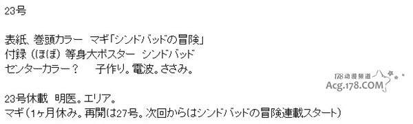 根据2ch情报师提供的情报,预计将于下周发售的周刊漫画杂志「少年SUNDAY」23号中,将宣布大高忍的漫画「魔笛MAGI」休载1个月的消息,目前具体休载原因不明。同时在次回杂志(5月8日发售)中将正式开始连载「魔笛MAGI」外传漫画「辛巴德的冒险」,23号杂志中还附送「辛巴德的冒险」的等身大海报。此外,大高忍的漫画「魔笛MAGI」将于6月的「少年SUNDAY」27号中回归。