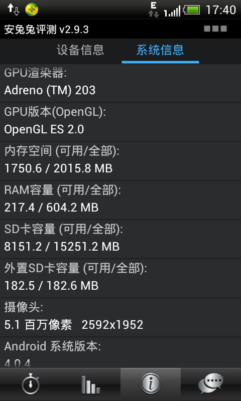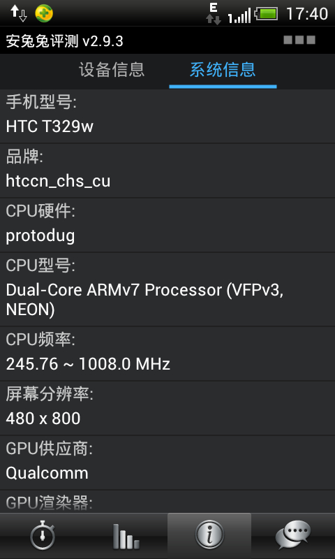 htc t329w安兔兔跑分与硬件配置信息截图。