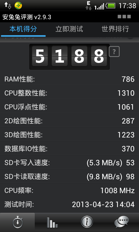 闲来无事,刚使用安兔兔测的,共机友参考。安兔兔软件不是最新版的,不想浪费流量升级。