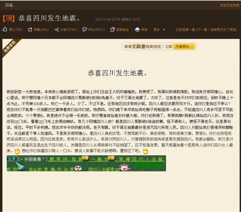 你说恭喜四川发生地震