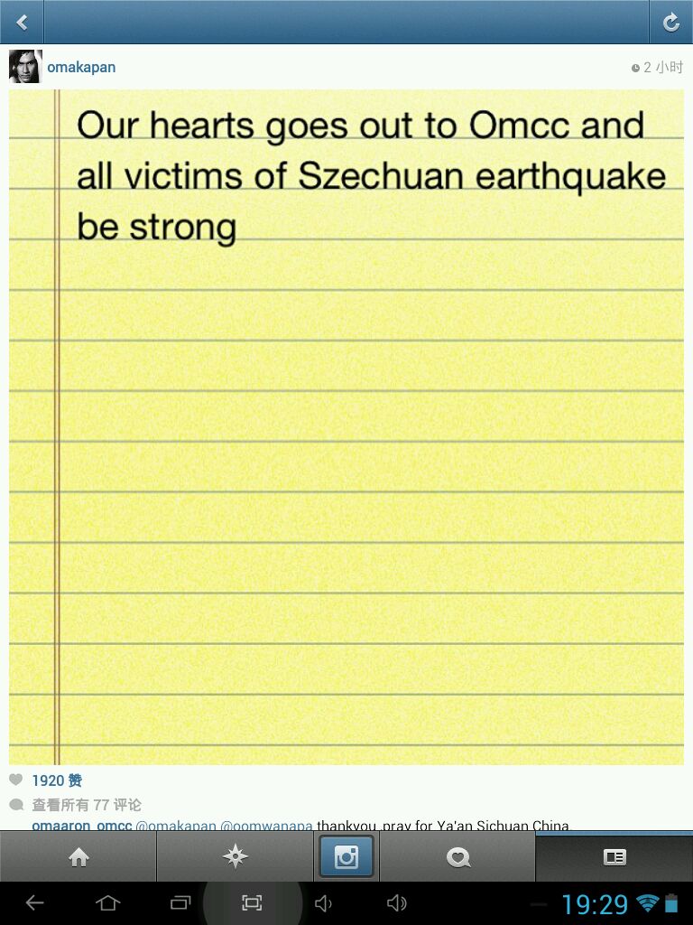 四川雅安在受到地震灾难的同时,也受到了全国各地以及各国友人的帮助和鼓励....咱们的偶像OM在此时也通过这种方式表现了对OMCC及灾民的关心,真心的谢谢了