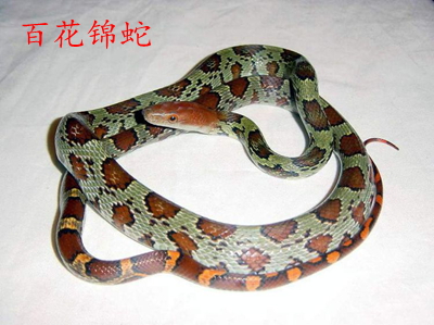 百花锦蛇在我们老家方言里面直接叫做百花蛇,蓝绿色的鳞片和褐红色的头很特征。我唯一就认出它了。小学时我们那收山货的收到一条几十斤重的百花锦蛇。百花锦蛇虽然无毒,但是我们那边的人都知道,百花锦蛇绝对不能放在靠近眼镜王蛇的地方,因为它的味道对王蛇是致命的