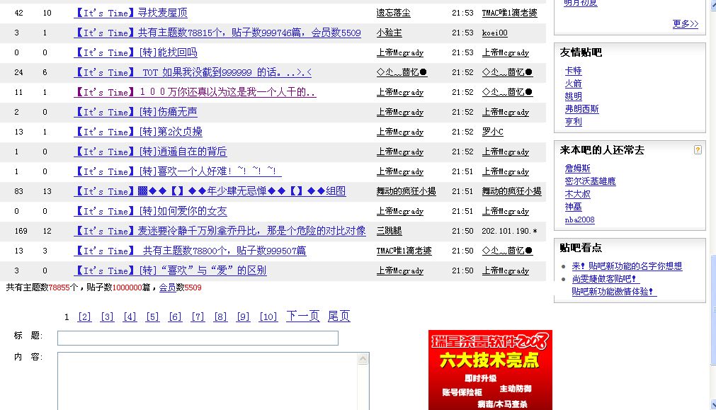 这是麦迪吧,100万贴的截图,还有80万截图,。、回想那时候,。。都是泪水。青春啦,。。