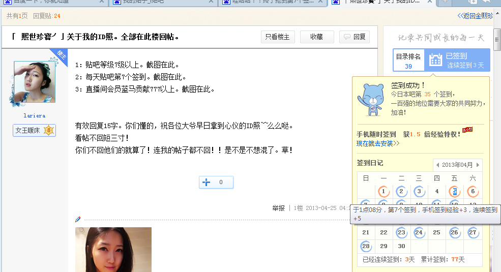 2:每天贴吧第7个签到。截图在此。
