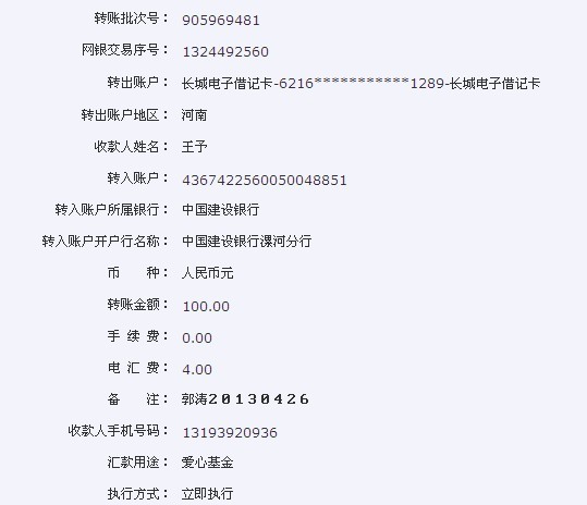我刚才通过网上转账往我们的爱心账号里转了100元,请注意查收,希望能够帮到这些孩子们。