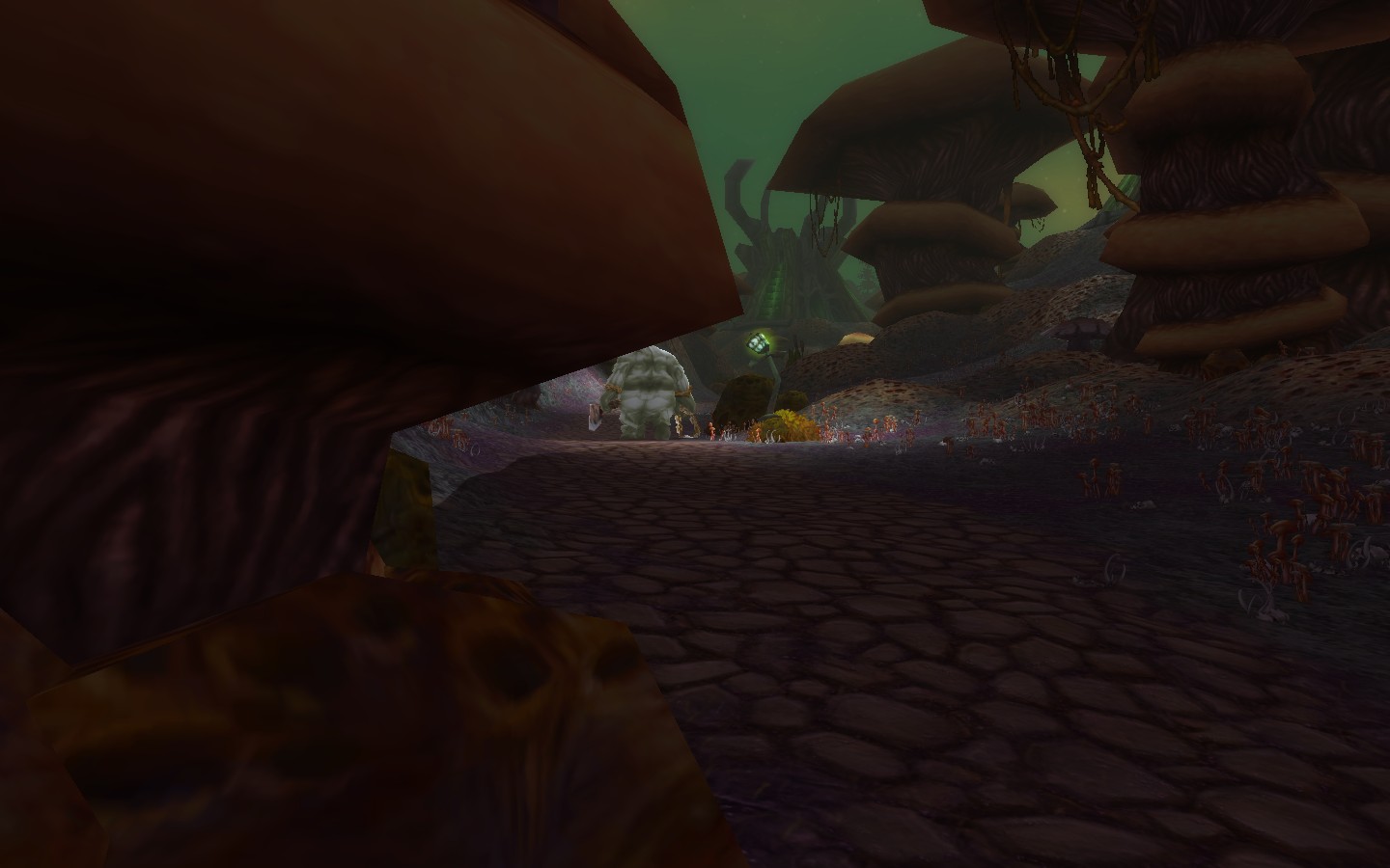 当我准备继续在四周寻找线索时我听见了沉闷的脚步声,这脚步声理我还挺远但是这一定是个巨大的家伙,这绝对不是我能对付的东西,我在他靠近之前赶紧抓上弓跑进了房屋背后的林地中,躲在不知道是什么的植物背后看着道路,我看见了一个巨大的身影,一个憎恶。
