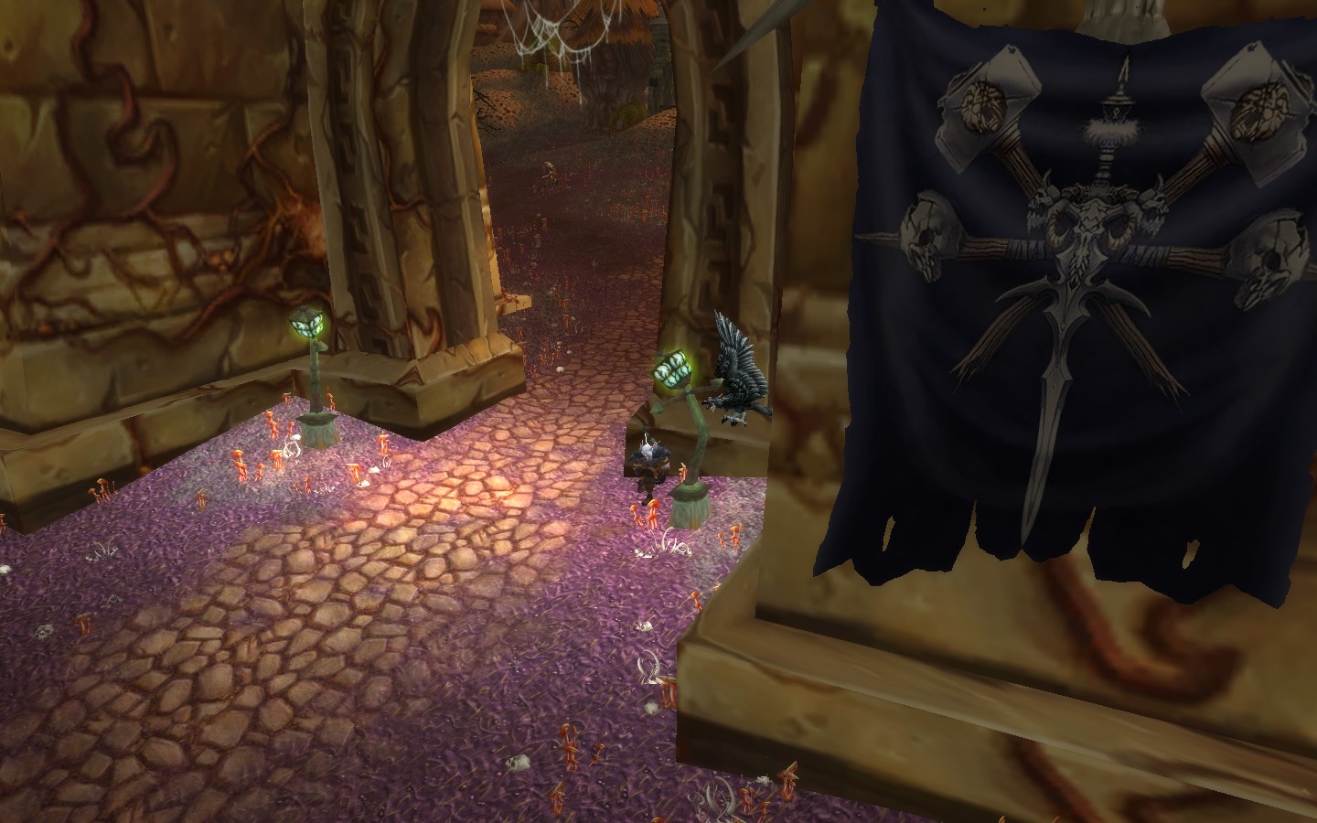我在哨塔上休息了一会就向大门进发,一路上竟然没有任何奇怪的东西出现在我眼前,这通向病木林的路安静的可怕,瑟兰迪尔跟着我安静的前行,没多久我们就来到了大门前。我靠在门边向里望去,我发现了第一个敌人,一个天灾战士。他似乎完全没有察觉到我的存在,趁他转身巡逻时我迅速解决了他。