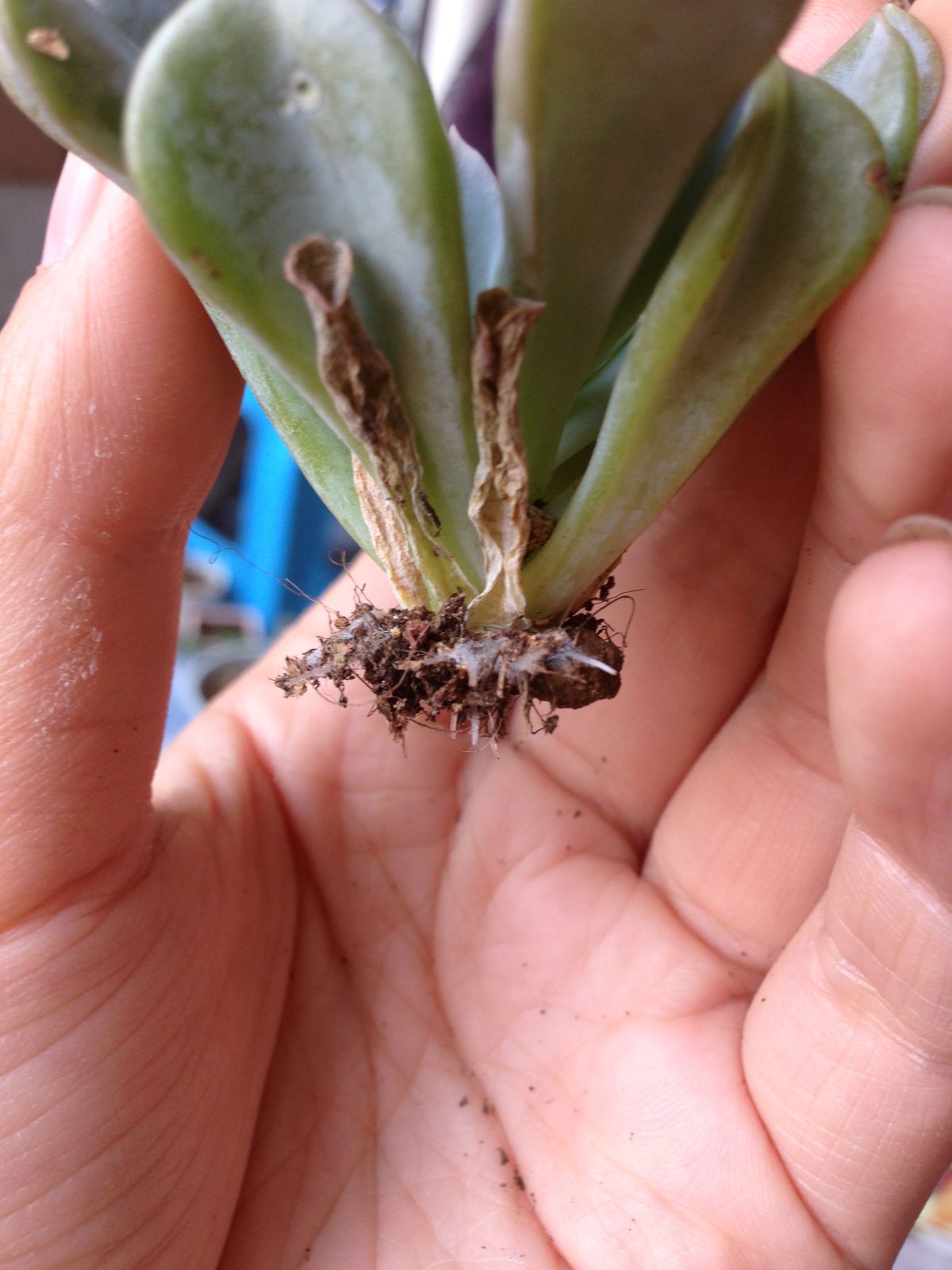 砍头的特玉莲终于发根了,挖出来一看,白嫩嫩的根上还有一丝丝绒毛。不知道这是根粉还是正常的根部组织。因为留的枝干非常短,这些白绒绒的根大部分是裸露在土外的。大仙救命。
