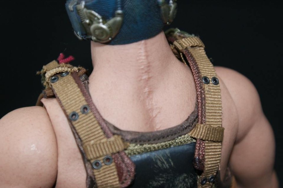 第二个介绍的是贝恩,贝恩整体来说还是不错的,配件感觉挺给力的,做旧的地台就很不错。首先来介绍下优点哈,细节给力例如头上的青筋脖子上的伤疤以及眉毛上的伤疤等都还原的不错。头雕制作的也很像(一部分原因可能在于口枷)。皮衣的质感很棒,里面的防弹衣效果也很好,做出了泥土沾在身上的感觉。缺点:眼神硬伤看起来太柔了,肌肉不够强壮尤其是腿部。然后应该就没什么了总体来说还是很棒的一款如果你是预定价买的那这个真是不可多得的好物啊