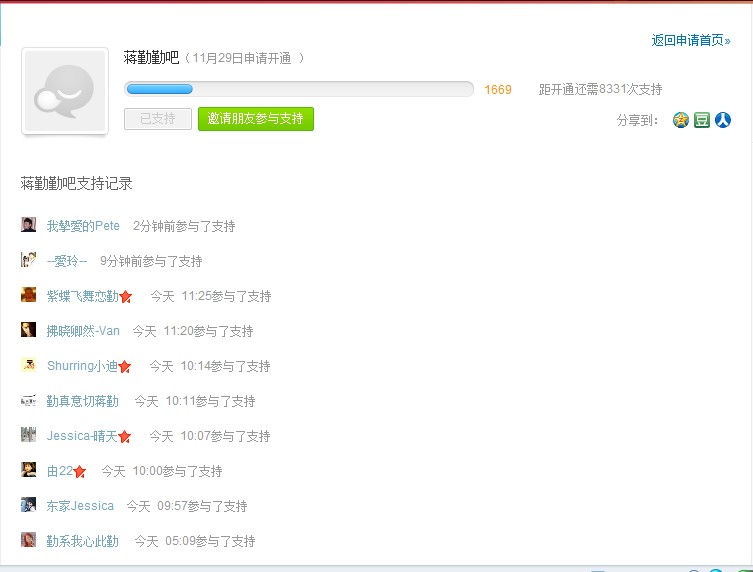 里面就勤吧的最慢了,如果大家愿意合作的话,我可以号召一下东家们一起支持勤吧,当然大家也要支持东吧开通才行哦。在我们支持勤吧的同时顺便点一下支持其他的吧,其实也花不了多长时间,就点一下鼠标的时间而已。看到大家每天都在支持,相信也希望早点开通的,大家来发表下意见吧。