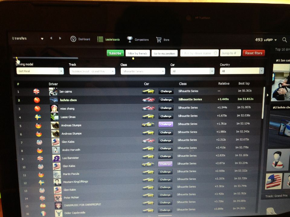 最近几天有新车了啊 昨天用sr9跑monza的时候 发现一个也很快的中国人耶 比我快了近1秒