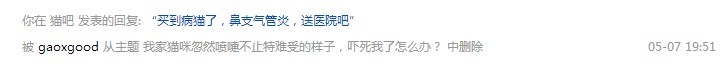 回复 gaoxgood :人用的感冒药不能给猫吃,小孩的什么感冒冲剂还真不知道能不能吃。我家奶猫打喷嚏是被消毒水熏的,当时就怕发展成鼻支什么的,大夫说如果打喷嚏带血沫肯定是鼻支。好像打喷嚏厉害了,大夫让喂氨基酸的什么粉,效果也很明显。