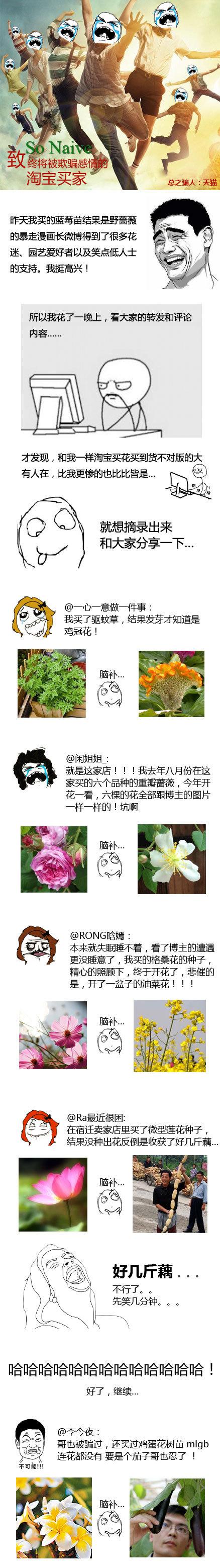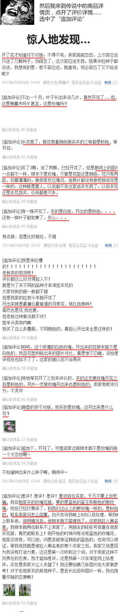 在淘宝买花苗,2个月后开花发现货不对版,然后仔细看了一下追加评论,能种活等到开花的全都是一样遭遇,而此时已经无法更改好评、无法申诉、无法售后。进一步百度“淘宝 宿迁 卖花”,你会发现,凡是属地宿迁、沭阳的园艺卖家,几乎都是评价很差的骗子,揭开了一个惊人的真相……