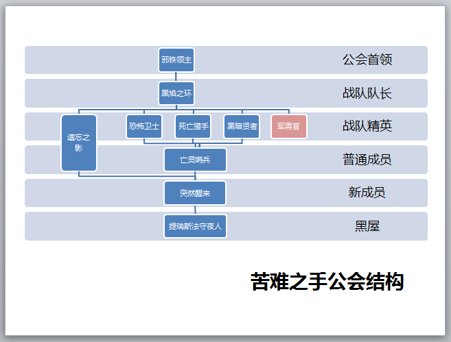 苦难之手是一个层级分明的组织,但在其中的地位同样意味着责任。黑焰之环以及精英队伍的成员人数限制十分严格,因为他们不仅是RP上的管理者和领导者,ooc上担负着同样的责任。苦难之手不允许官员尸位素餐,晋升也是给予那些有能力和热情的成员。晋升方式: