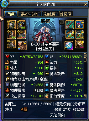 80了,基本没进过几次pk场,闲着没事进去玩玩,知道限制多,不用无色,我还特意找一段的p,那两个都没到70,输了,一句垃圾人就走了,弄得我一肚子气,附上属性图。