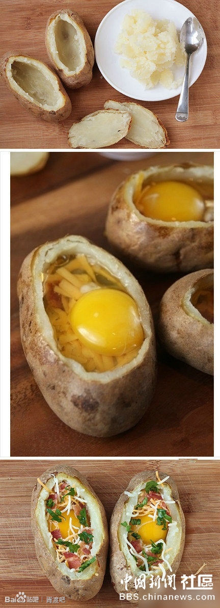 把土豆洗净蒸熟,挖空后塞点喜欢的蔬菜培根奶酪条什么的,打入一个鸡蛋,再放入烤箱烤熟。美味极了