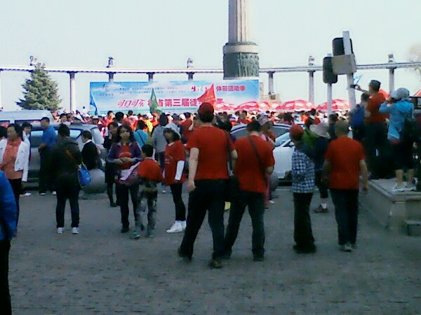 这是先出发的一批参与者,估计是把试枪当成出发令了。但事实上主办方通知的时间的确是七点五十,可是我们却是八点十分才正式出发的!