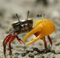 这是海边的一种螃蟹 一个钳子大 一个钳子小 喜欢钻在沙子里面 那个大钳有红色的跟黄色的 跑的特别快