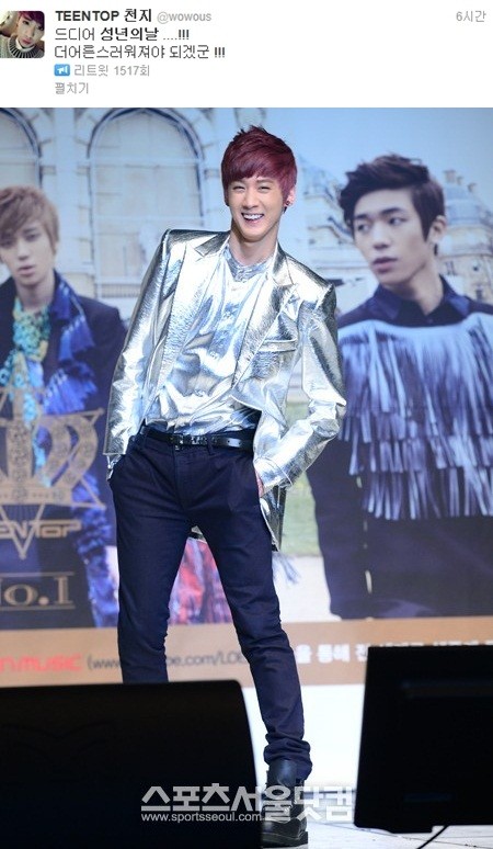 偶像团体TEENTOP的成员天地(21,本名李赞熙)迎来了成年之日,并发表了对将来的决心。天地于20日上午在自己的推特中留言“终于等到了成年的这一天!得变得更加成熟才行啊!”留下了成年的感想。