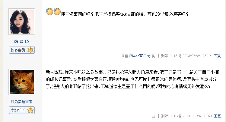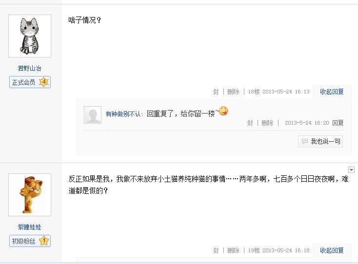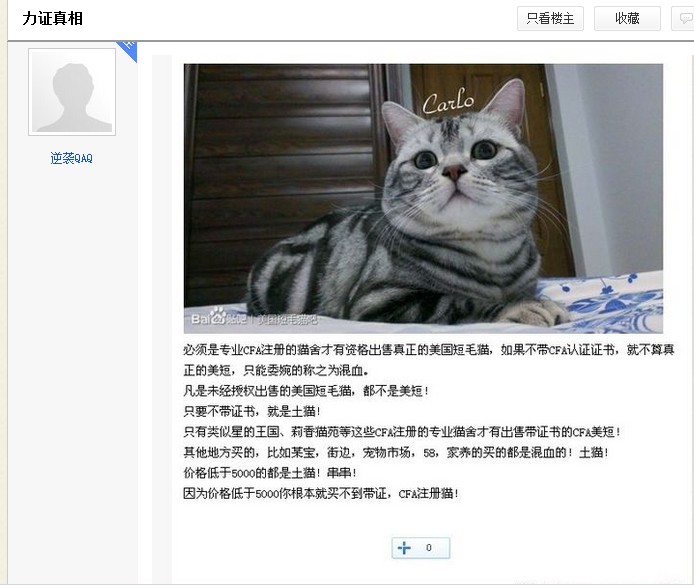 2.在对品种猫和CFA有了解之后,我并不觉得卡洛的繁殖者有多正规,就是个有CFA的后院罢了。且不说卡洛的爸爸是从上海买来的未绝育的猫舍退役种猫,当年为了尽快脱手全部猫口而去繁殖金毛,将卡洛以那么低的价格卖给我。之后看着卡洛长出来了、我再次去追寻证书时,以各种理由想让我交多少多少“手续费”,知道整个发展过程的人不是那么一个两个。我知道即使我把这个在贴吧公开说出来,也会有人说这是编的;即使卡洛的纸我买回来贴出来,依旧会有人说这是套证这是买来的balabala╮(╯▽╰)╭无所谓~卡洛是我自己的,我知道真相如何就足够了,质疑的声音再多,他的漂亮可爱依旧不减半分,也不影响我和他之间的点点滴滴。