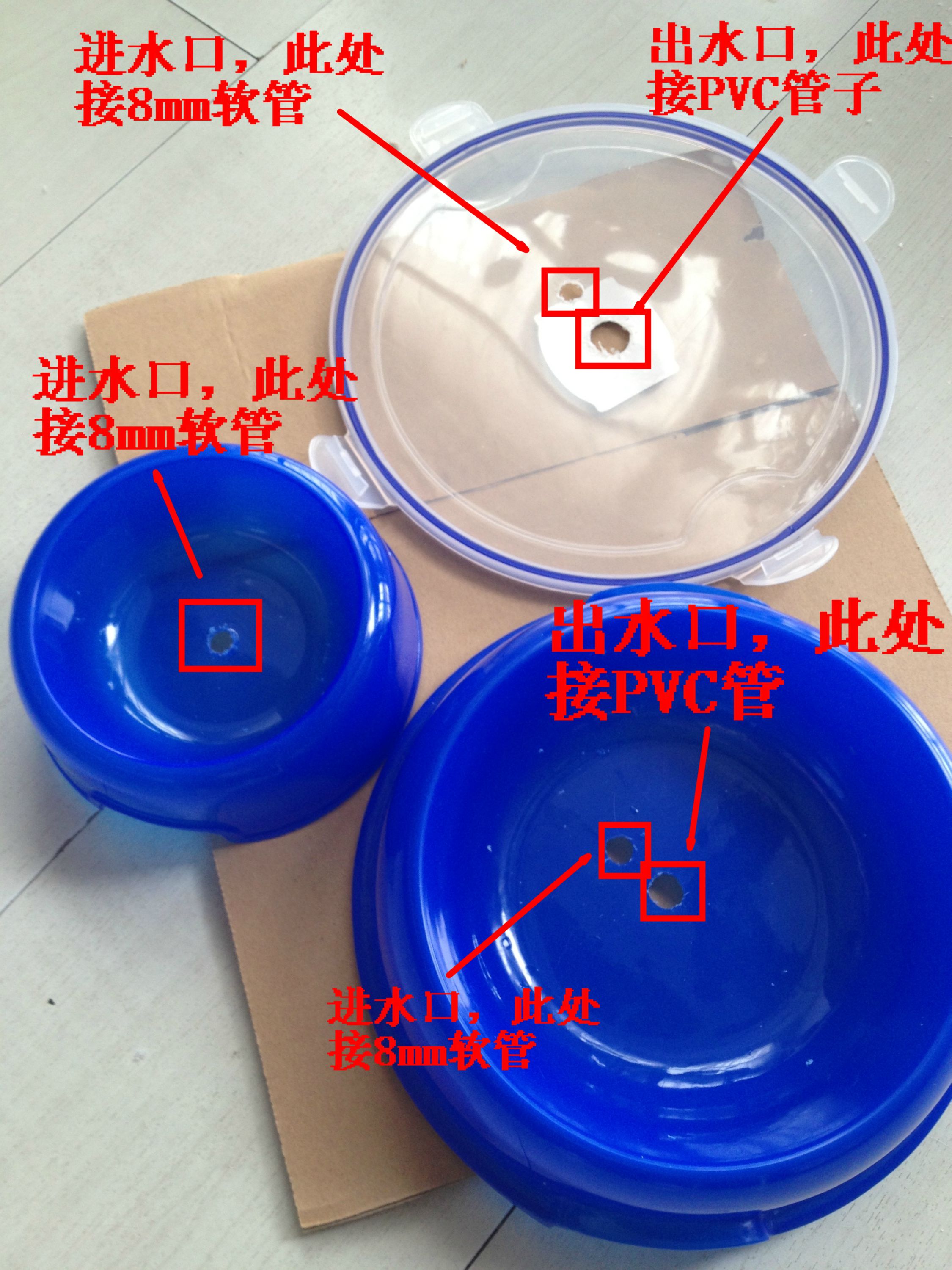 8mm软管分别穿过小碗和大碗,所以先穿管子然后再把小碗用热熔胶固定在大碗里面