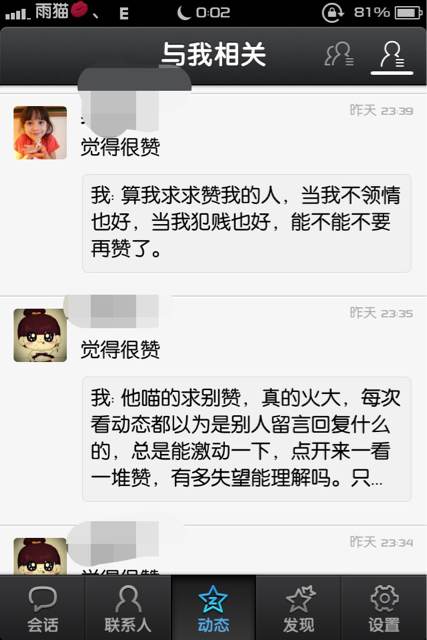他喵的火大的一塌糊涂,以为是回复,点开一看一堆赞,很失望能理解吗?只赞不回复到底是什么心态,不说心情失落,流量也至少值点钱好伐。