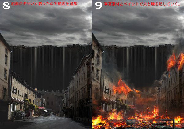 次に街を燃やしていきます。このときも烟のライティングに注意してペイントしていきます。火も同じように见えて表情、スケール、パースが违うので注意。家もこんがり焼いていきます